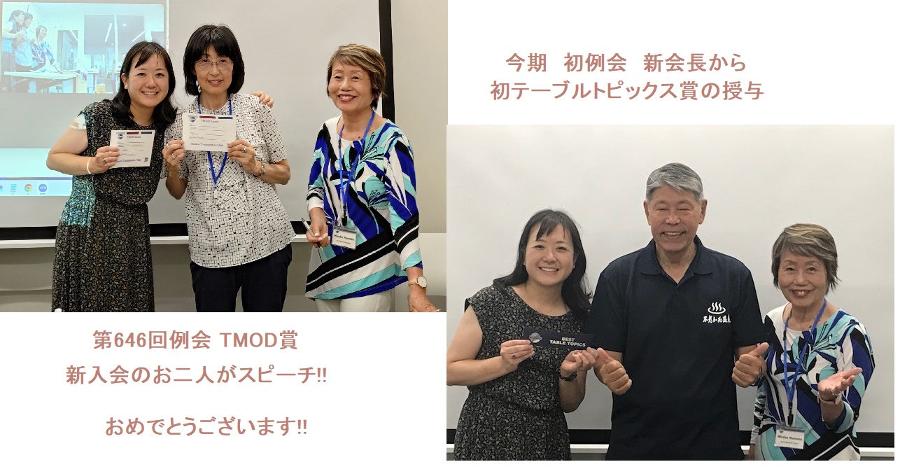 本日は、第646回の例会です。今期はじめての例会です。TMOD(本日の司会)は私、Hiroko です。入会されてそれほど日数は絶っていない女性メンバー2名のスピーチがあります。