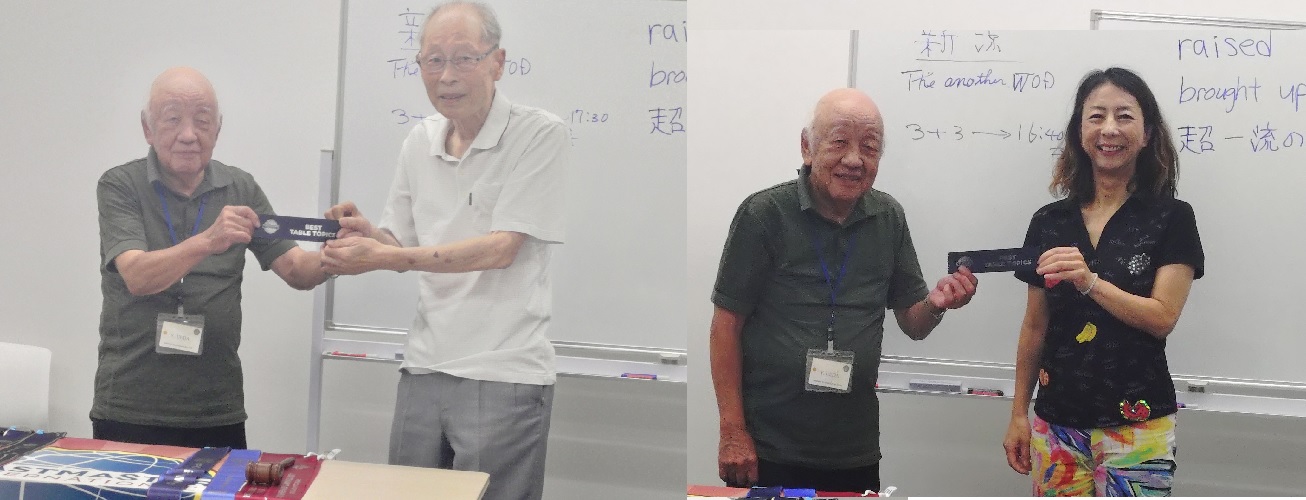 最後にアワード受賞式です。今日のベストTT賞に加え、その例会の司会を担当するTMODがその例会にいちばん貢献した会員に贈るTMOD賞はEvalauatorの代行を担当してくれたKazuoさん。TT賞は再びKazuoさんと今日入会されたMihoさんでした。今年92歳のKazuo さんはダブル賞を受賞され大奮闘でした。