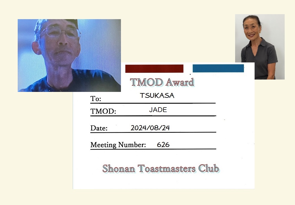 本日のBest Table Topics賞はゲストのAyakoさん、TMOD賞はツカサさん。