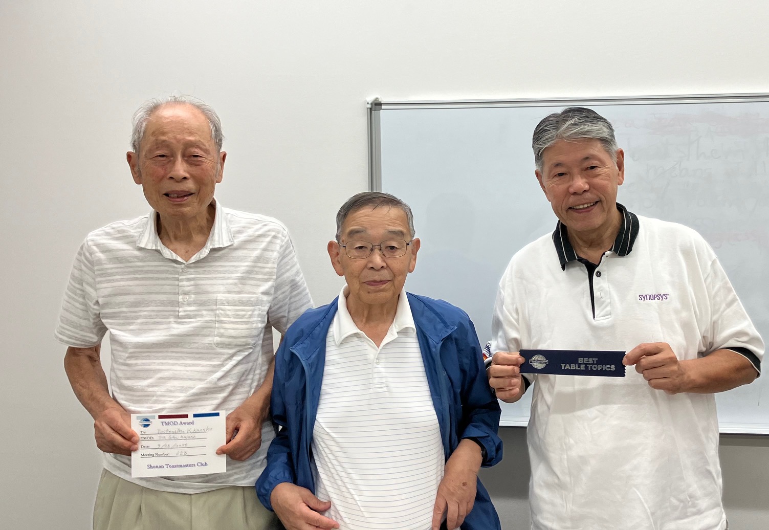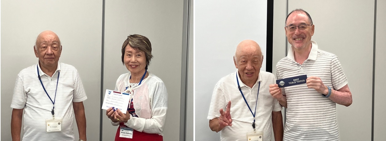 本日のBest Table Topic Speaker賞はウクライナの展望について話されたIchiさん、TMOD賞は最高齢メンバーにもかかわらず、General EvaluatorとTimerを引受けてくださったKazuoさん。Ichiさん、Kazuoさん おめでとうございます!!